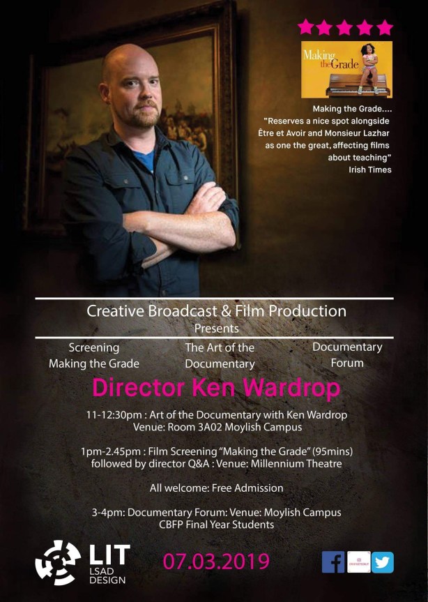 Creative Broadcast and Film Production LIT presents The Art of The Documentary with award-winning documentary director, Ken Wardrop on Thursday 7th March at LIT Moylish.