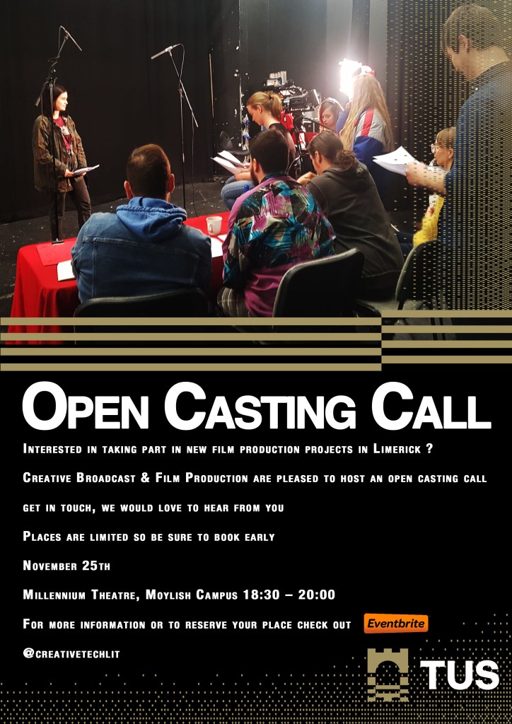 The Creative Broadcast & Film Production Programme at LSAD, TUS are delighted to announce details of their next open casting call. If you are interested in taking part in short film productions and voice over work check out their Eventbrite site to secure your place and receive details of script preparation and time allocation. They will be recognising full Covid compliance during the session so it will be a fun and safe event. Check out the link above or click on the image below, to book your place.
