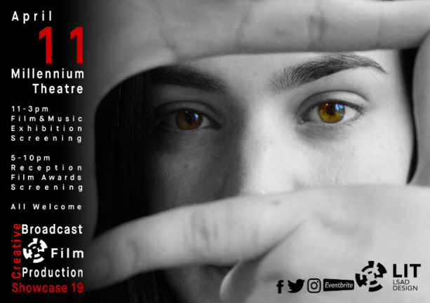 Creative Broadcast & Film Production students and staff of LIT were delighted to present the LSAD Film & Media Showcase19 at the Millennium Theatre. The daylong showcase was a joyous celebration of the ingenuity, creativity, and often times intriguing work created by the students of Creative Broadcast & Film Production. Nigel Mercier dropped in on the day to offer an overview of the role of a broadcast & Film extra. Nigel’s company, “SetExtras” is the leading extras company in the West of Ireland. Providing extras since 2016 for TV Commercials, Music Videos, and local International Films. This was followed by “Scene and Heard”, directed by Eoghan Neff, Lecturer on the Music Technology and Production programme, whose students from the Interactive Audio module demonstrated live interpretations of audio recorded from a selection of short video scenes. The showcase reception kicked off with great anticipation and was created and run by first year Creative Broadcast students which ran in perfect harmony with music put together by students of Music Technology directed by lecturer Mike Gavin. The Screening itself, proudly opened by Mike Fitzpatrick Dean of the School of Arts LSAD and supported by the head of department of design James Greenslade, was a festive celebration of all things sound and vision. The energy and enthusiasm of the audience and the general camaraderie amongst the students was infectious, a glorious night of visual storytelling and jubilant entertainment was had by all. Special thanks to the film & media companies who came on board to celebrate and support the work of these talented filmmakers. It is brilliant to witness the growing film and media industry here in Limerick and their support of emerging film makers through offering work experience and supporting the showcase is remarkable.