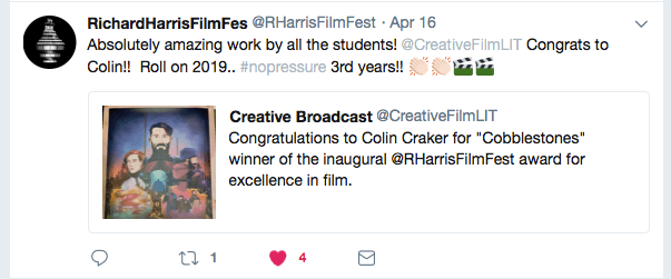 ”The partnership of both festivals will cement its place on the Irish Film Festival circuit and coincides with the new third level programme at LIT in ‘Creative Broadcast & Film Production’. With the short film awards show returning there is certainly a lot to look forward to in October and beyond.”